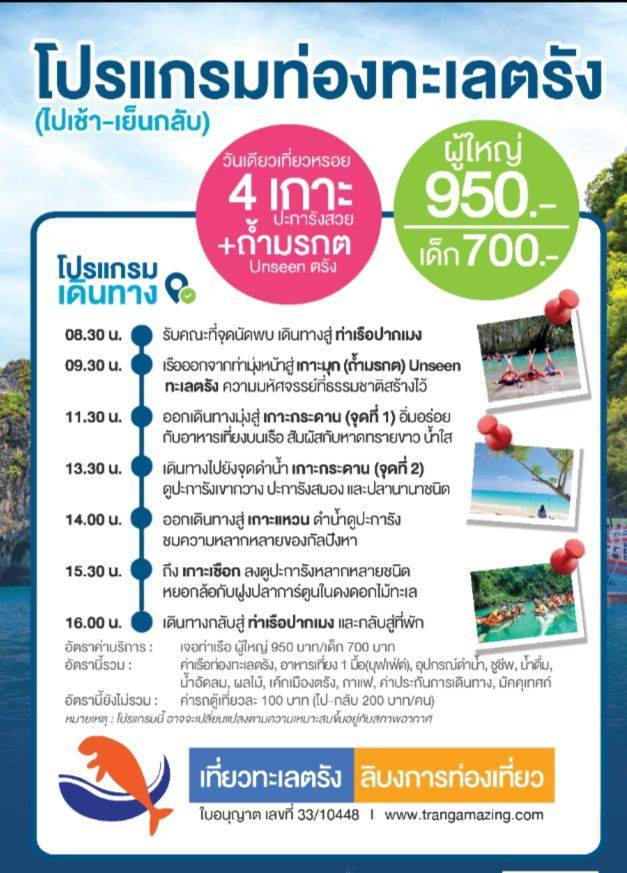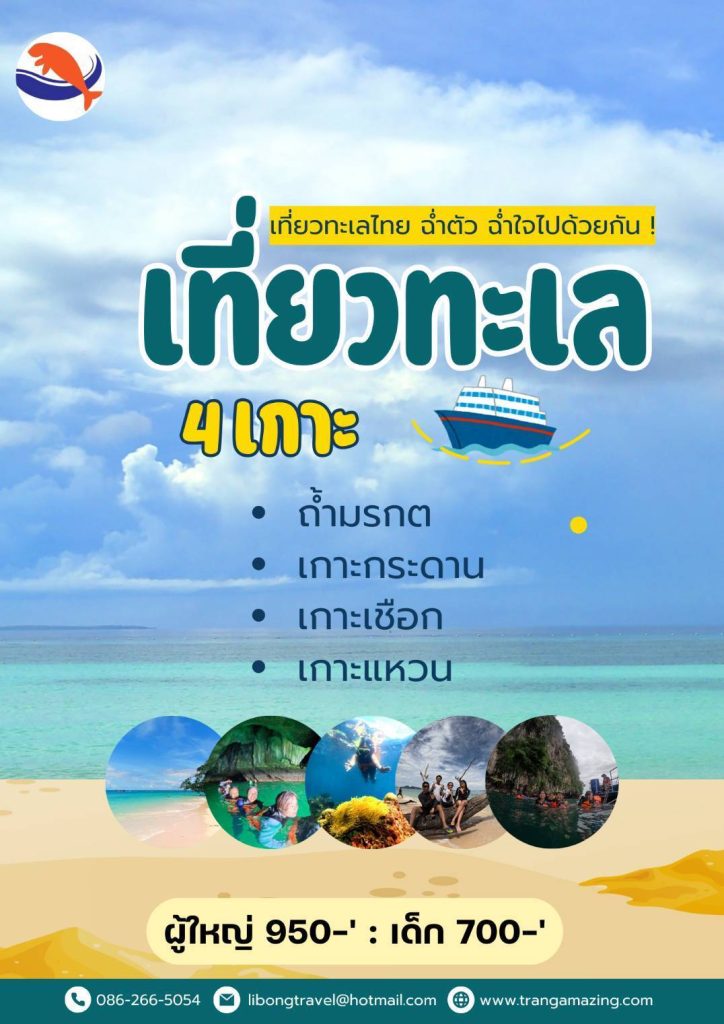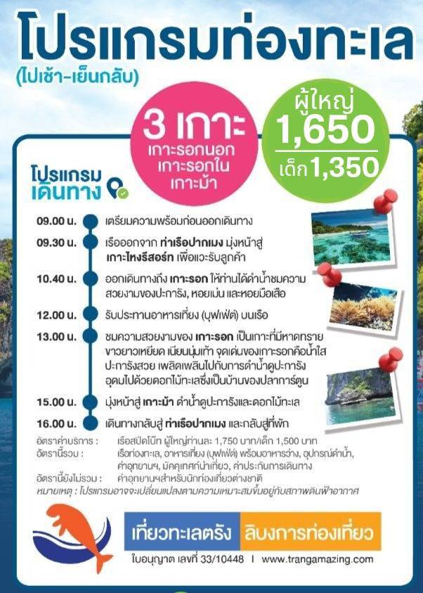- มีโปรแกรมให้เลือกทั้งแบบ 3 เกาะ และ 4 เกาะ หากต้องการเที่ยวครบ ใช้เวลาเพียง 2 วัน เที่ยวทะเลตรังได้อย่างคุ้มค่า