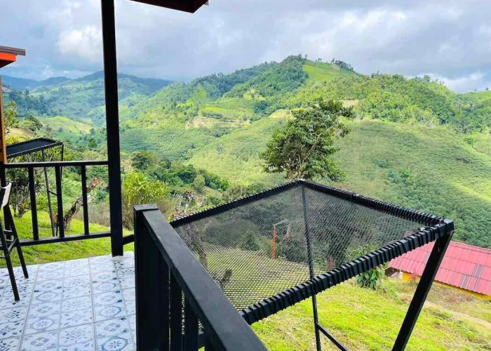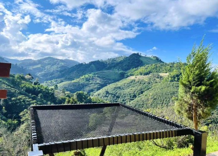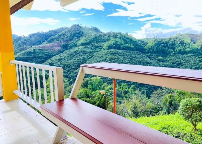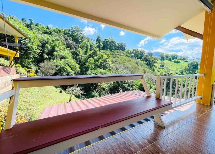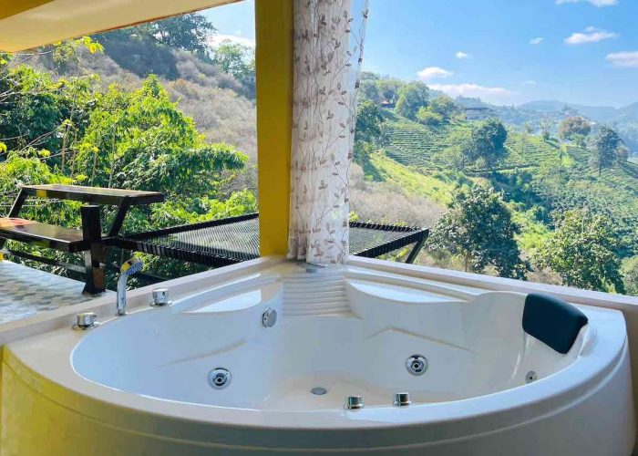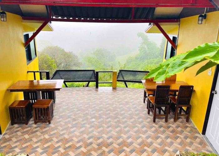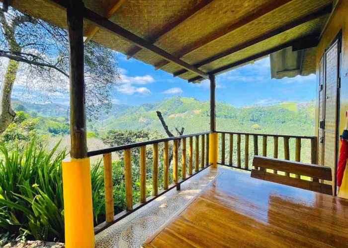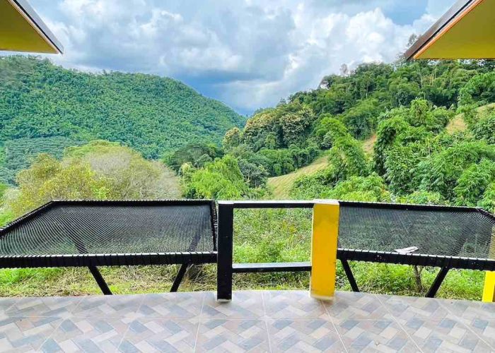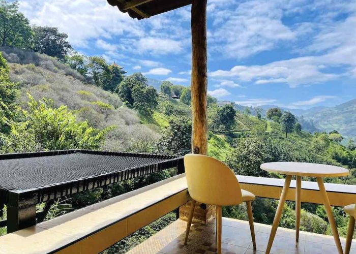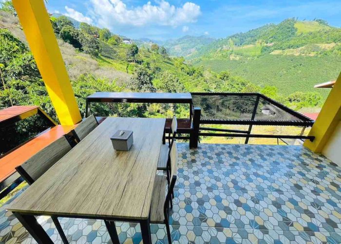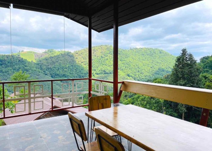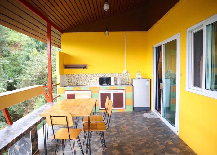ด้านหน้าตัวบ้านเป็นระเบียงกว้าง มีม้านั่งและเปลตาข่ายรับลมชมวิวภูเขาและไร่ชา