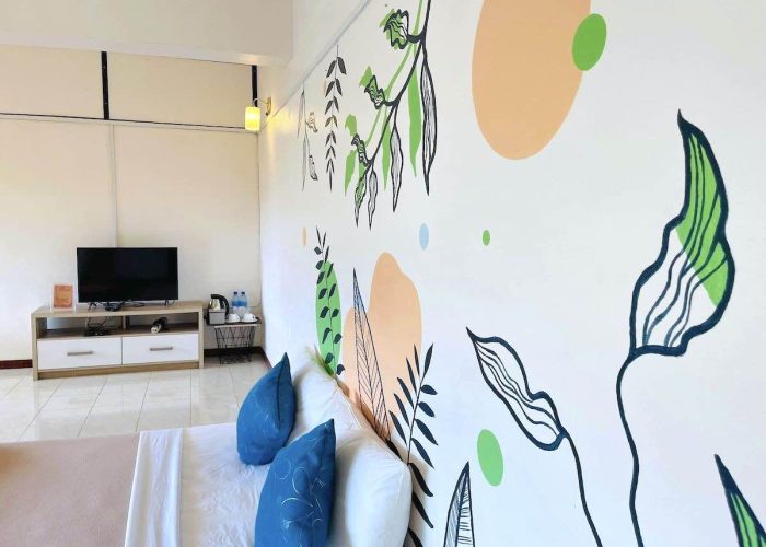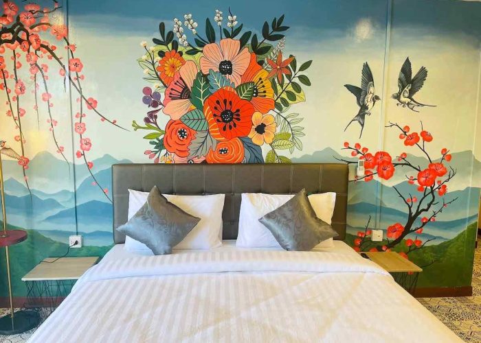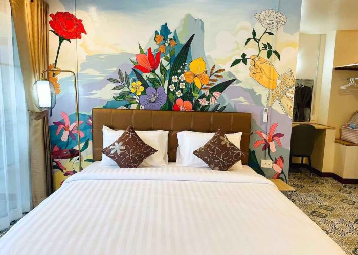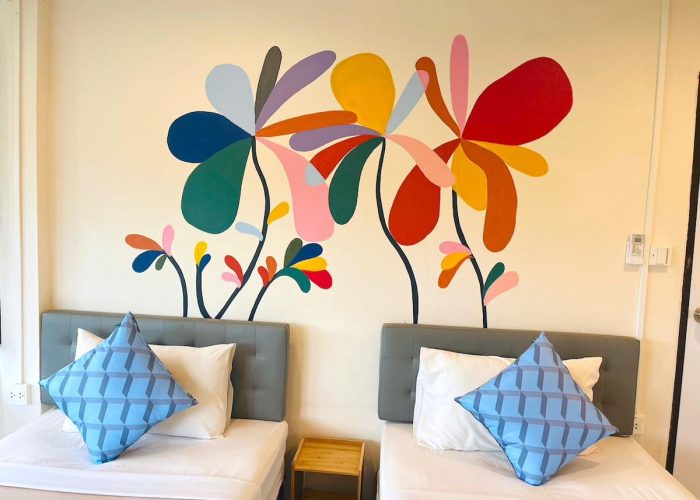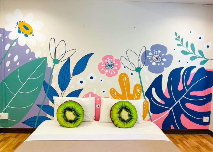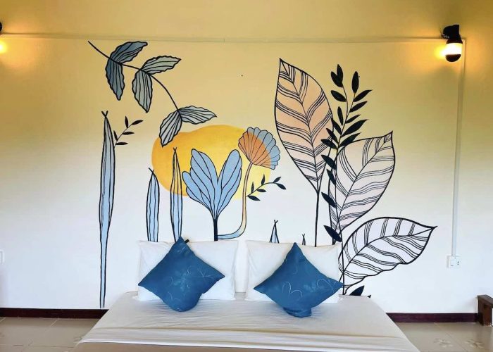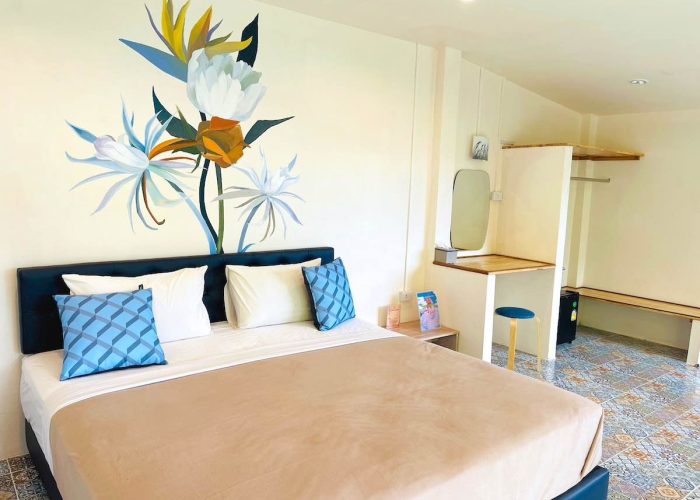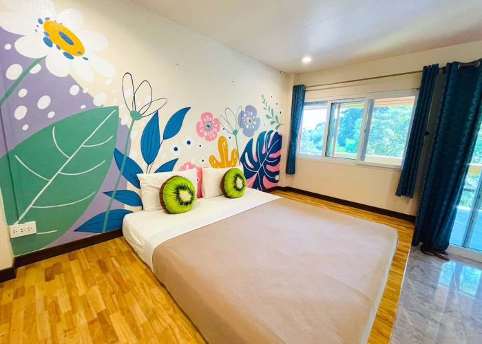 เตียงเป็นฟูกใหญ่บนพื้นห้องยกระดับ ภาพวาดเป็นรูปใบไม้เรียบๆ สวยงามอ่อนหวาน ช่วยให้ผ่อนคลาย และนอนหลับได้เต็มที่ เหมาะสำหรับคู่รัก