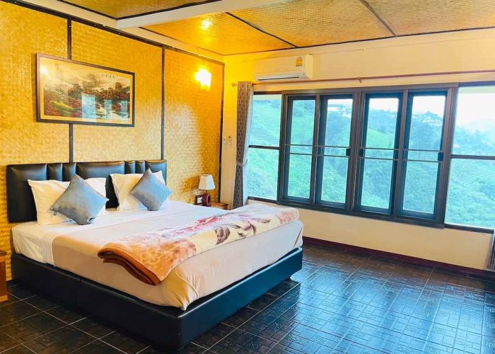 A1 และ A2 (ห้องแอร์) บ้านวิวไร่ชาและภูเขา ห้องพักเน้นพื้นที่ใช้สอยที่กว้างขึ้น ตำแหน่งชมวิวสวยไม่แพ้ใคร พักได้ 2-4 คน ห้องนอนเป็น 2 เตียงเดี่ยว A1 เป็นโทนสีน้ำเงินสงบเงียบ ส่วน A2 เป็นโทนสีน้ำตาลอบอุ่น มีจุดเด่นที่ระเบียงหน้าบ้านกว้าง และห้องน้ำใหญ่ ใช้สบาย ส่วนเปลตาข่ายยื่นออกนอกระเบียง ชมวิวเขาวิวดาวรอบด้านได้เต็มตาตลอดวันคืน เหมาะสำหรับพักกับเพื่อน หรือจะเลื่อนเตียงนอนติดกันสำหรับคู่รักก็สะดวก