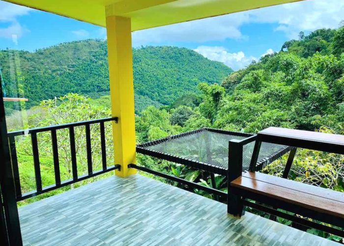 ด้านข้างตัวบ้านเป็นระเบียงยาว มีม้านั่งและเปลตาข่ายรับลมชมวิวสวยโล่งๆ กับพระอาทิตย์ตกได้