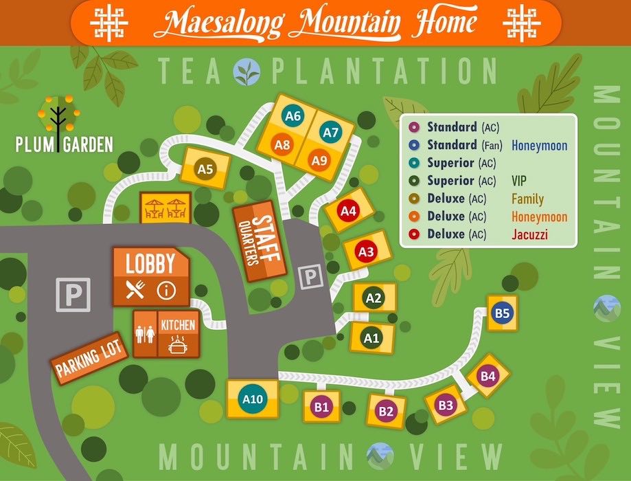 ที่ตั้ง บนไหล่เขาส่วนตัว กลางแปลงพืชเมืองหนาว ไร่ชา และทิวเขาสูง ห่างจากจุดชมวิวดอยแม่สลอง ประมาณ 2 ก.ม.