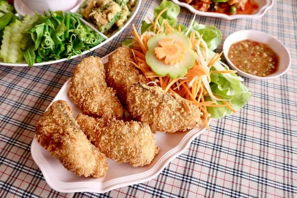 - ปลาทอดไร่จันทร์แรม ปลาช่อนสดๆ แล่เป็นชิ้น ชุบเกล็ดขนมปัง ทอดกรอบนอกนุ่มใน กลิ่นหอมกรุ่นรสกลมกล่อมพอดีๆ เสิร์ฟพร้อมน้ำจิ้มซีฟู้ด