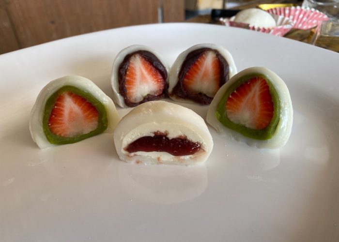 มีให้เลือก 3 แบบ ไส้ถั่วแดงสตรอว์เบอร์รี่, ชาเขียวสตรอว์เบอร์รี่ และครีมชีสซอสสตรอว์เบอร์รี่