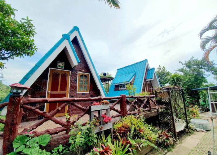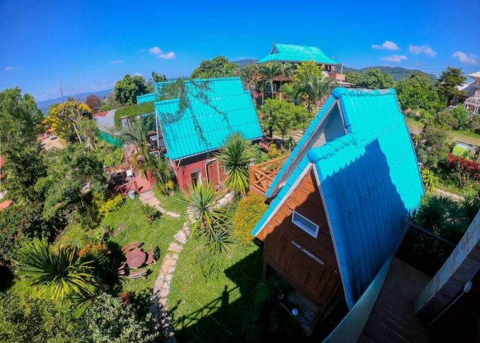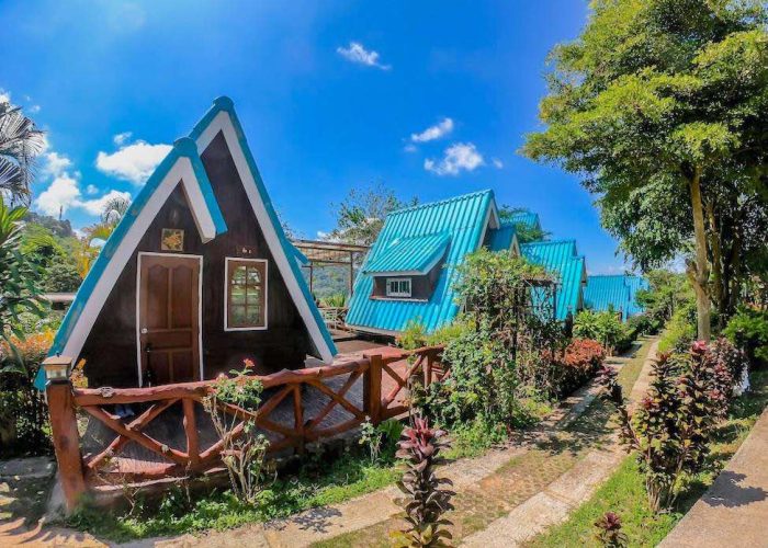 สไตล์ที่พัก: บ้านพักและห้องพักหลังคาสีฟ้าสดบนเนินเขาทรงเอเฟรมและอาคารโรงแรม